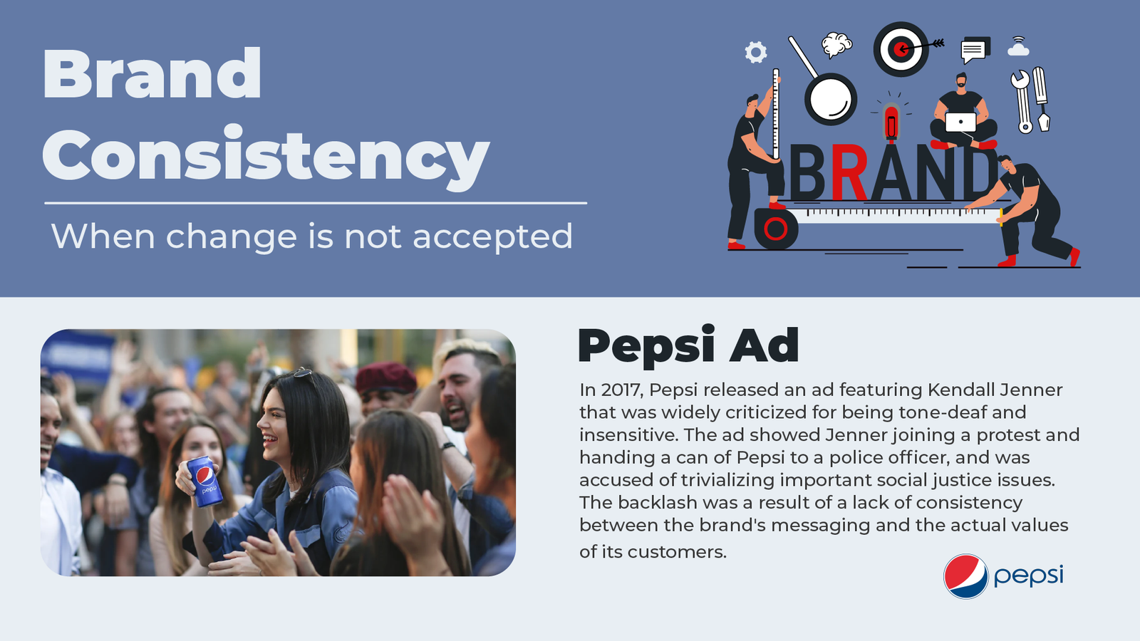 In 2017, Pepsi released an ad featuring Kendall Jenner that was widely criticized for being tone-deaf and insensitive. The ad showed Jenner joining a protest and handing a can of Pepsi to a police officer, and was accused of trivializing important social justice issues. The backlash was a result of a lack of consistency between the brand's messaging and the actual values of its customers.